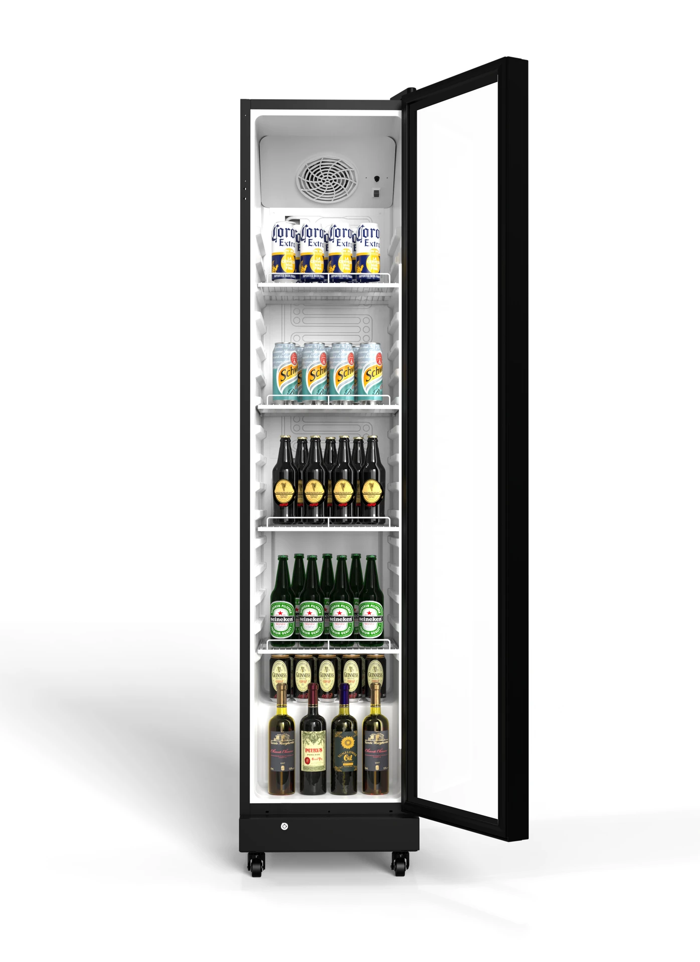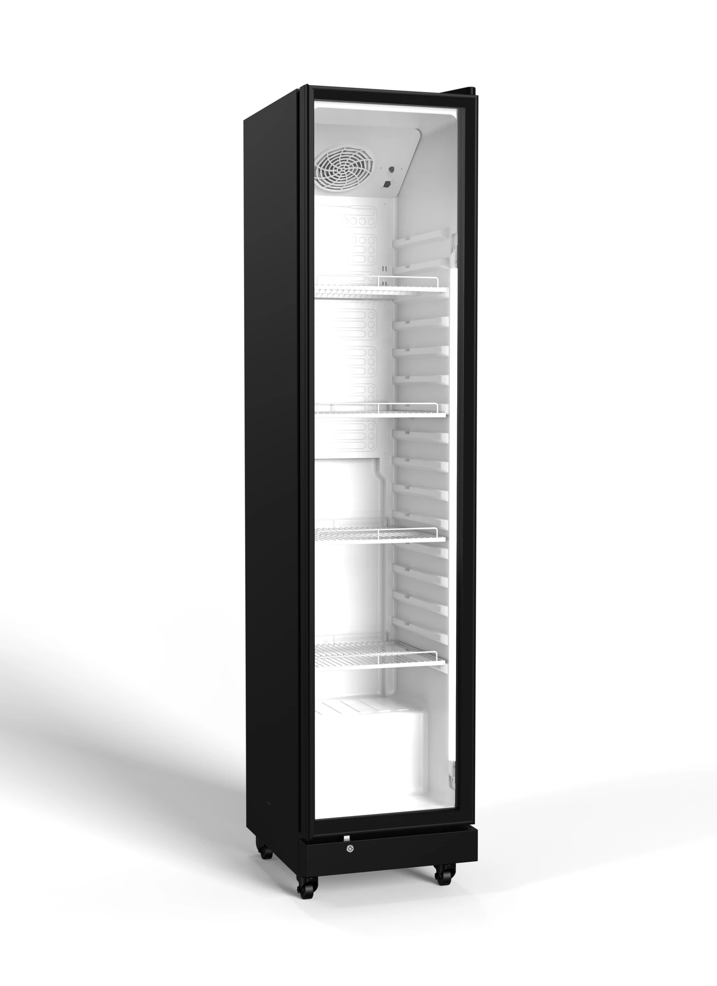 Volně stojící moderní chladící vitrína o objemu 235 l a s 4 drátěnými policemi.