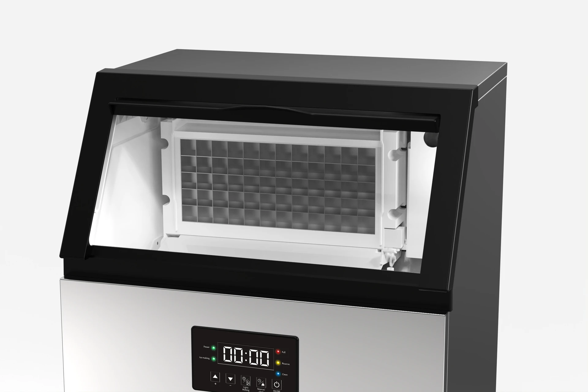 - Průhledné víko pro snadnou vizuální kontrolu procesu výroby ledu a stavu zásobníku na led